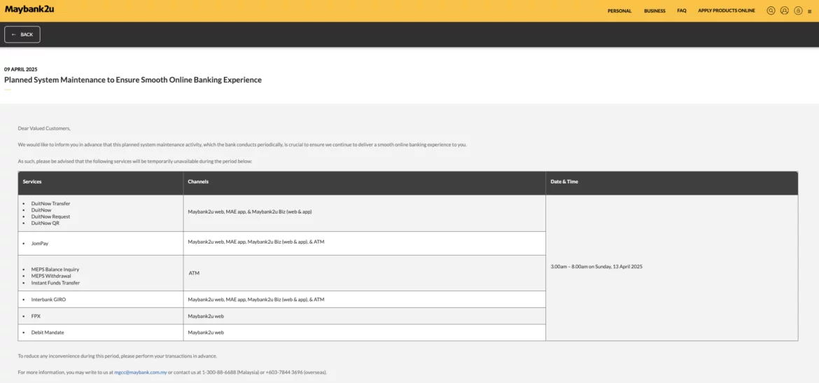 根据马来亚银行(Maybank)最新官方通知,该行将于2025年4月13日(星期日)凌晨3点至早上8点进行系统维护作业。在维护期间,多个服务平台将暂时无法使用,其中包括:Maybank2u 网站、MAE App、Maybank2u Biz 商业平台、FPX 在线支付服务,以及Maybank自动提款机(ATM)等与转账和交易相关的功能。